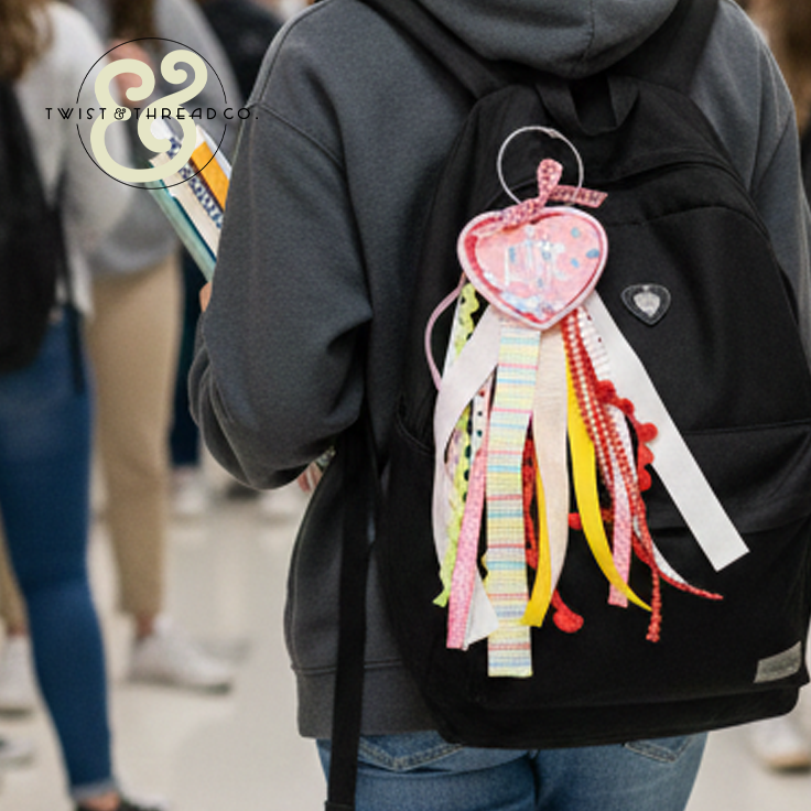Materials: Durable vinyl, high-quality embroidery thread, assorted textile ribbons, and metal hardware.